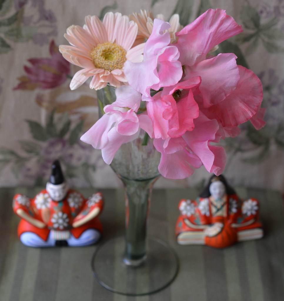 ガーベラ2本・スイトピー2本の花束。 短く切ってグラスに挿しました。