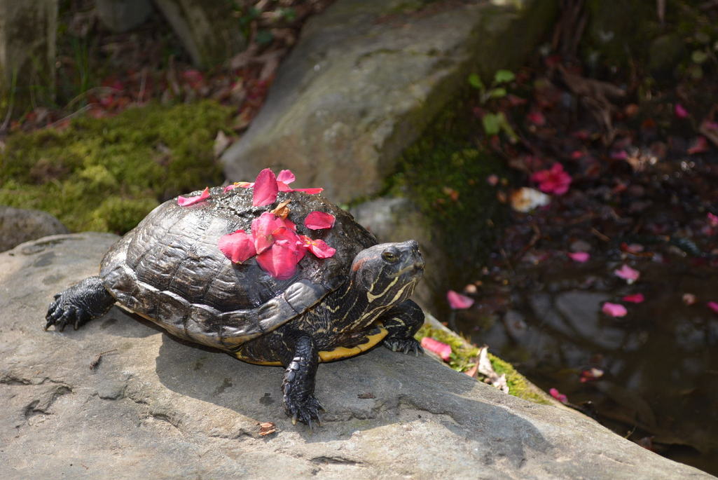 甲羅に泥と山茶花の花弁をまとって。