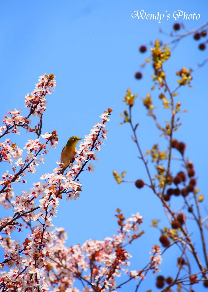真っ青な空の下、メジロちゃんがおいしそうに杏の花の蜜を吸っていました(*^^*)