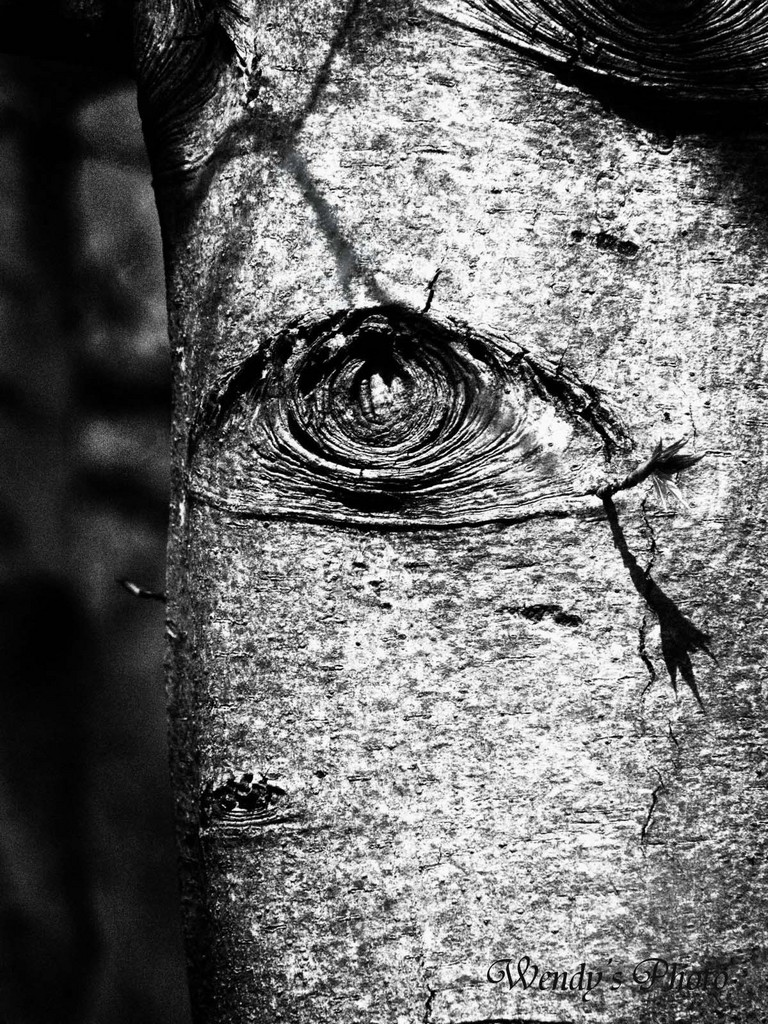 木の幹が目玉の形に!? ちょっと怖かったので、写真もホラーに撮ってみました(笑)