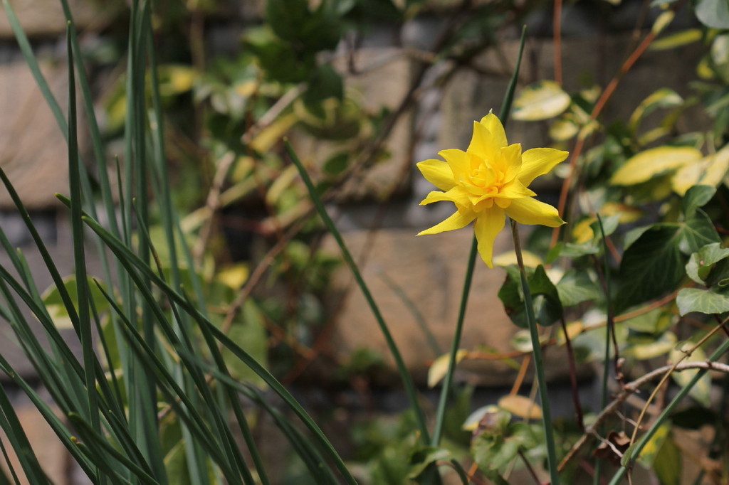 はっきりした黄色が個性的なスイセンです。段々花壇のバックの煉瓦が、花色をいっそう引き立ててます。