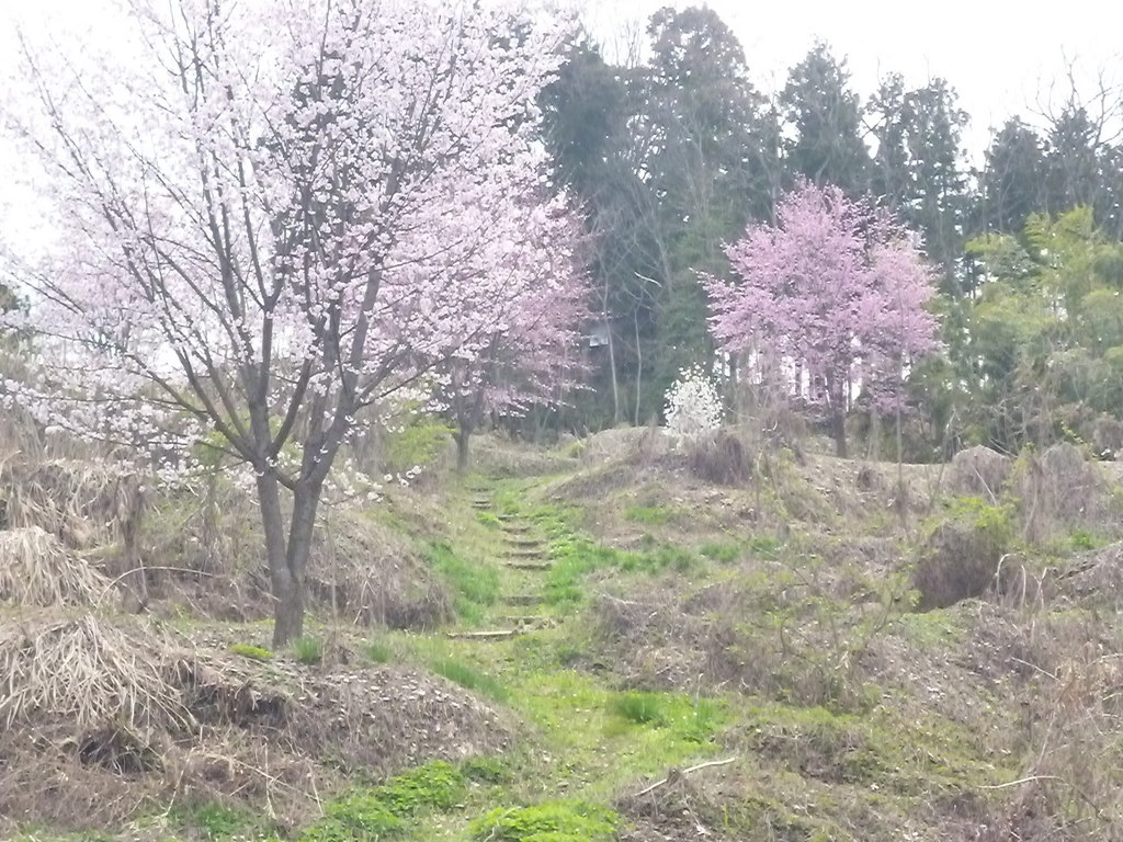 成沢城址の大山桜が満開。 足元には二輪草の群生。