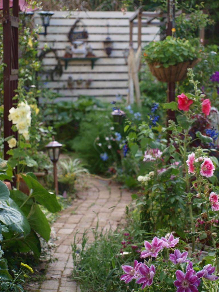 今年は草花中心のレンガの小道。ホリホックやクレマチスが庭を彩る。