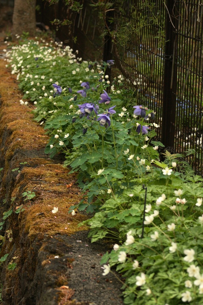 これは庭の東側の道路沿いのフェンスに沿って植えている二輪草と紫の深山オダマキ。二輪草は毎年この時期に満開となって道行く人たちを楽しませてくれています。