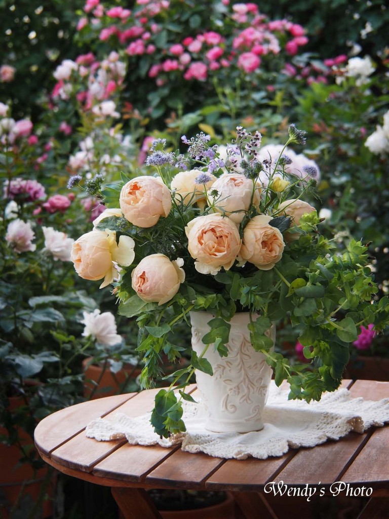 お友達がお土産にくれたバラでアレンジメントを作りました。ジュードジオブスキュア、いい香りでした。ちょっと時間がたってから撮ったのでバラの間に入れてたギリアが上向いちゃいましたが^^;