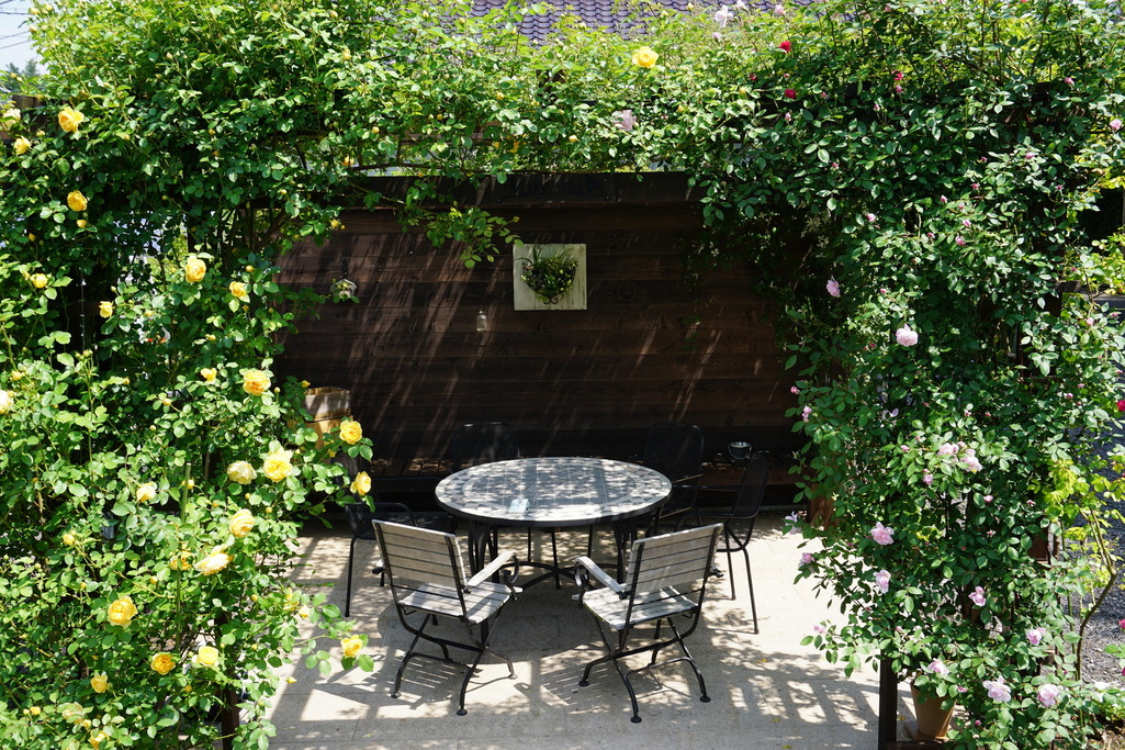 縦×横×高さが3.6m×3.6m×2.4mのパーゴラです。北側に物置を作りました。
