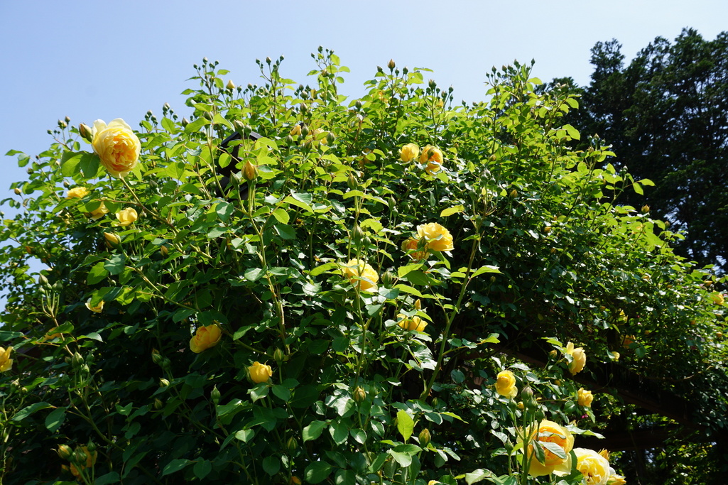 パーゴラの南西の柱にからんでいるグラハムトーマスです。植えてから3年目の姿です。