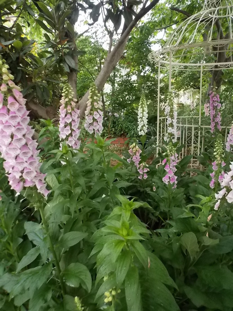 ジキタリスの花がてっぺんまで開花する頃、百合コンカドールが次の主役を目指して成長しています。