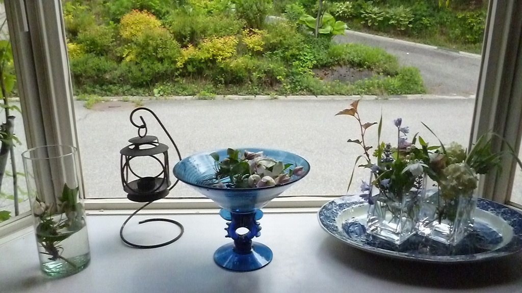 道路に面した出窓に花を絶やさないよう、アレンジしています。