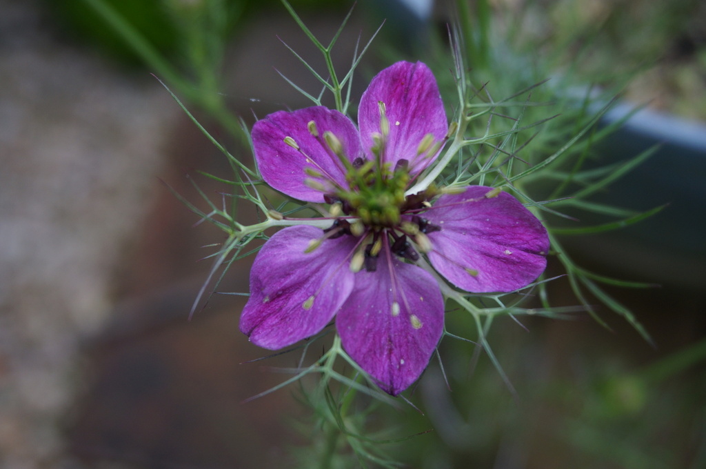 通り道に芽を出して何度か引っこ抜こうとしたニゲラ。この1本だけがシングル咲き。しっかり種を採る予定。
