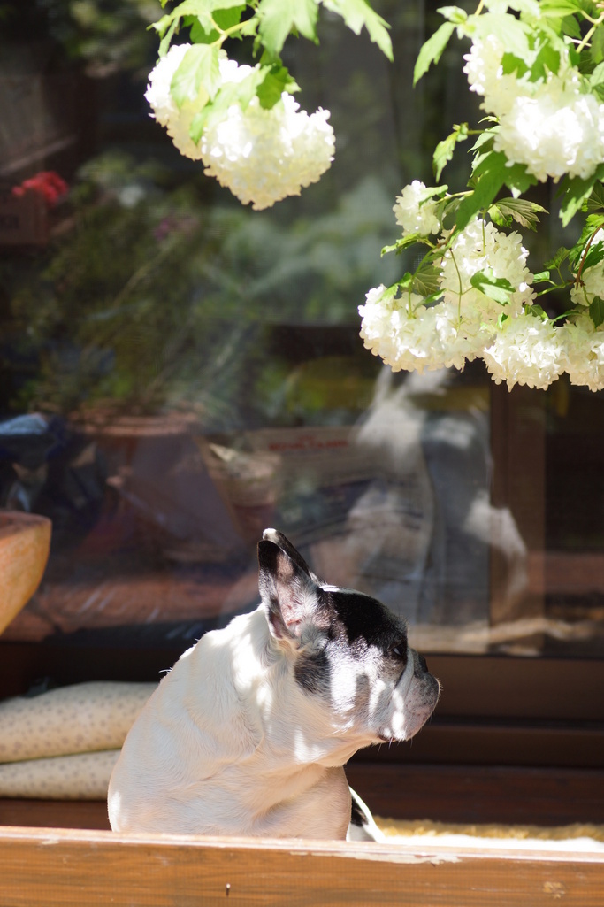 お日様とお花が見えるこの場所が彼のお気に入り。スノーボールと一緒に。