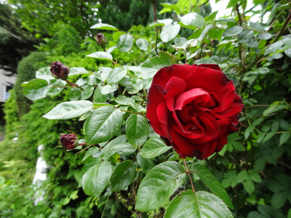 今年3番目に咲いたバラは、入居した時から植わっている濃い赤のバラでした。