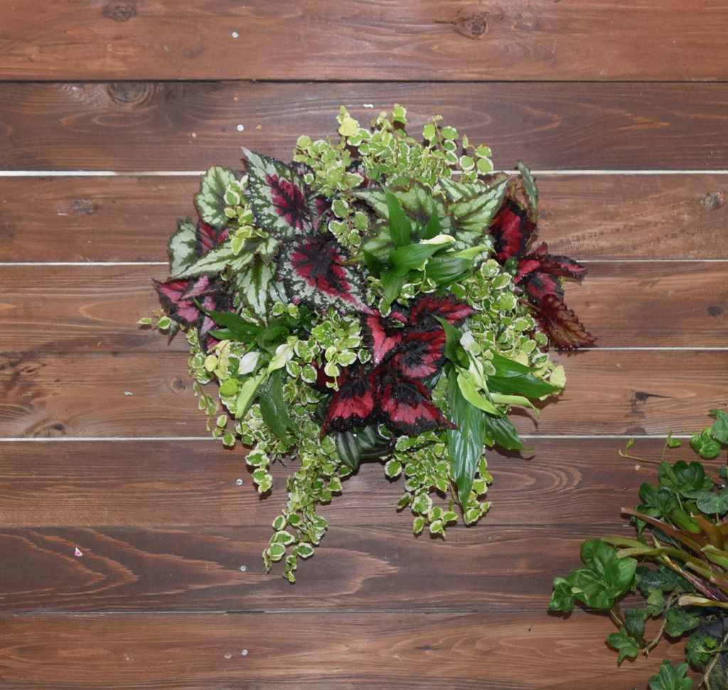 レックスベゴニアと観葉植物でハンギングを作りました。