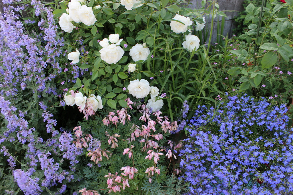 真っ白なアイスバーグとブルーとピンクの宿根草たちが、とても居心地よさそうにみえます。