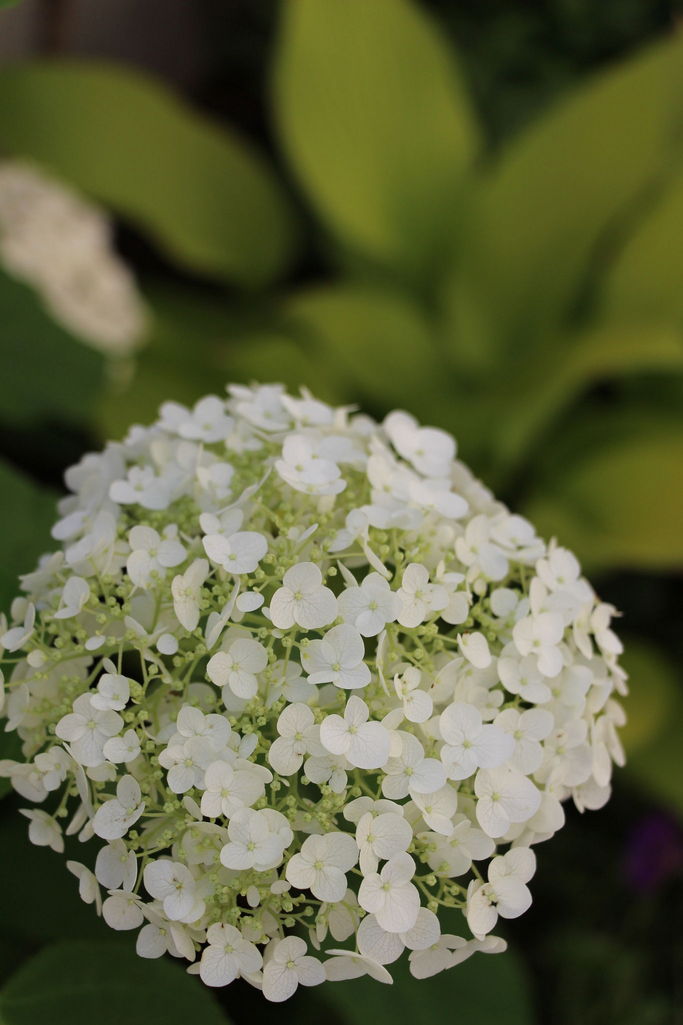 梅雨空にふんわりホワイト。ホスタの葉っぱとコラボです。