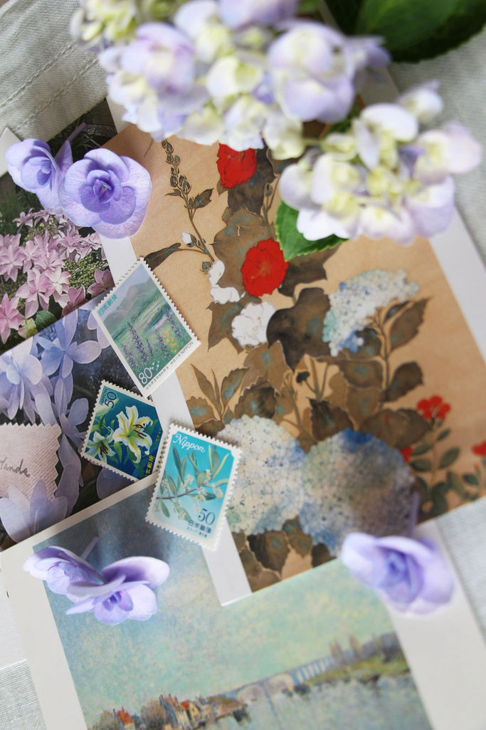 この季節、アジサイや水色がきれいな絵葉書が届きます。ホルダーから出して飾るのも楽しいです。