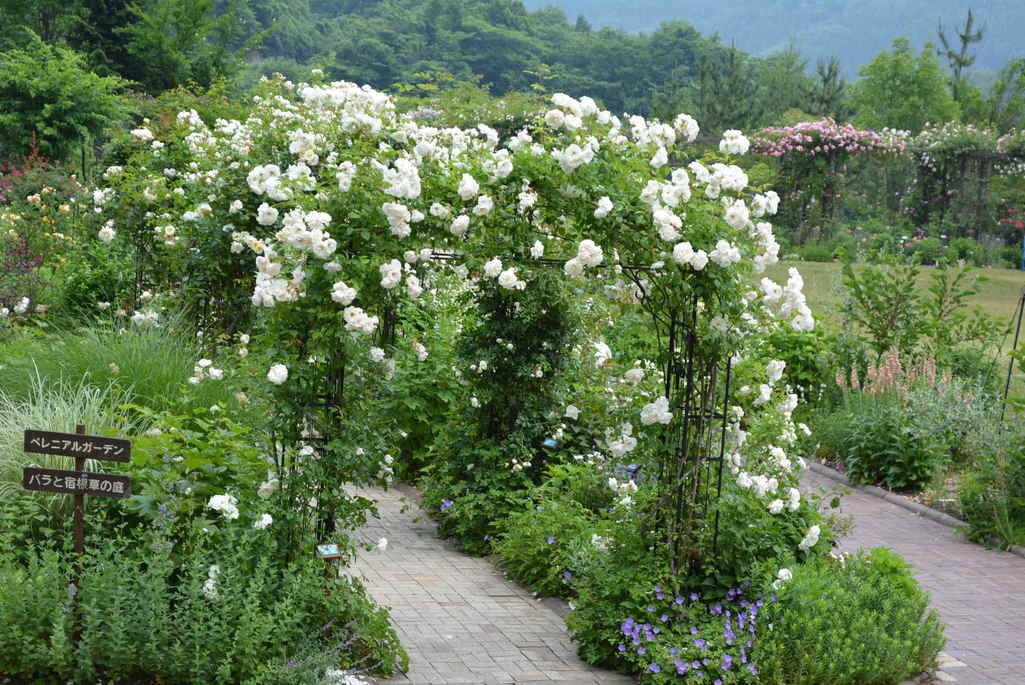 白い薔薇のアーチを抜けると黄・橙色系のアーチ、ピンク系のアーチと続きます。
