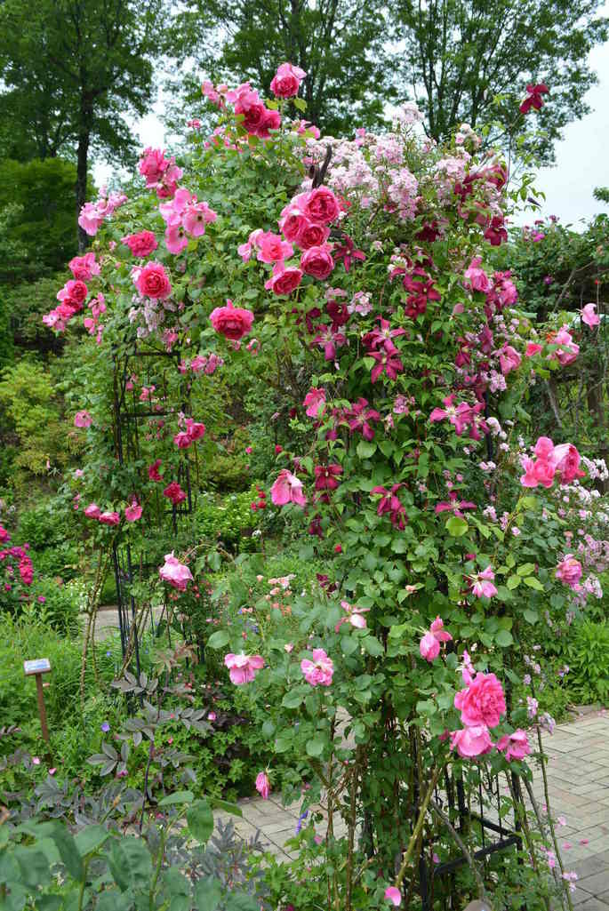 パレード・夢乙女・クレマチスが絡みあって可愛らしいピンクのアーチになっていました。
