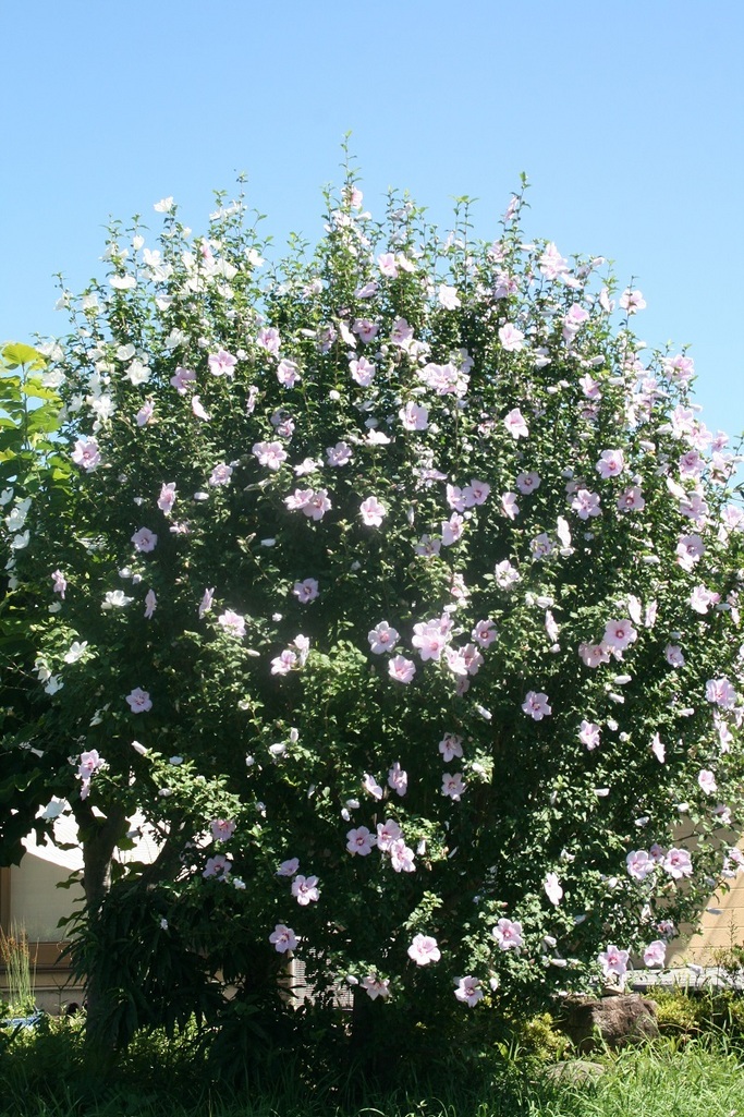 小鳥が運んだ実生から咲き出した、白とピンクの木槿です。