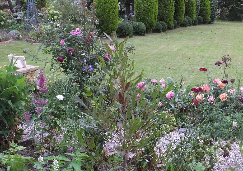 テラス前の庭のイングリッシュローズの 二番花が元気よく咲いていました