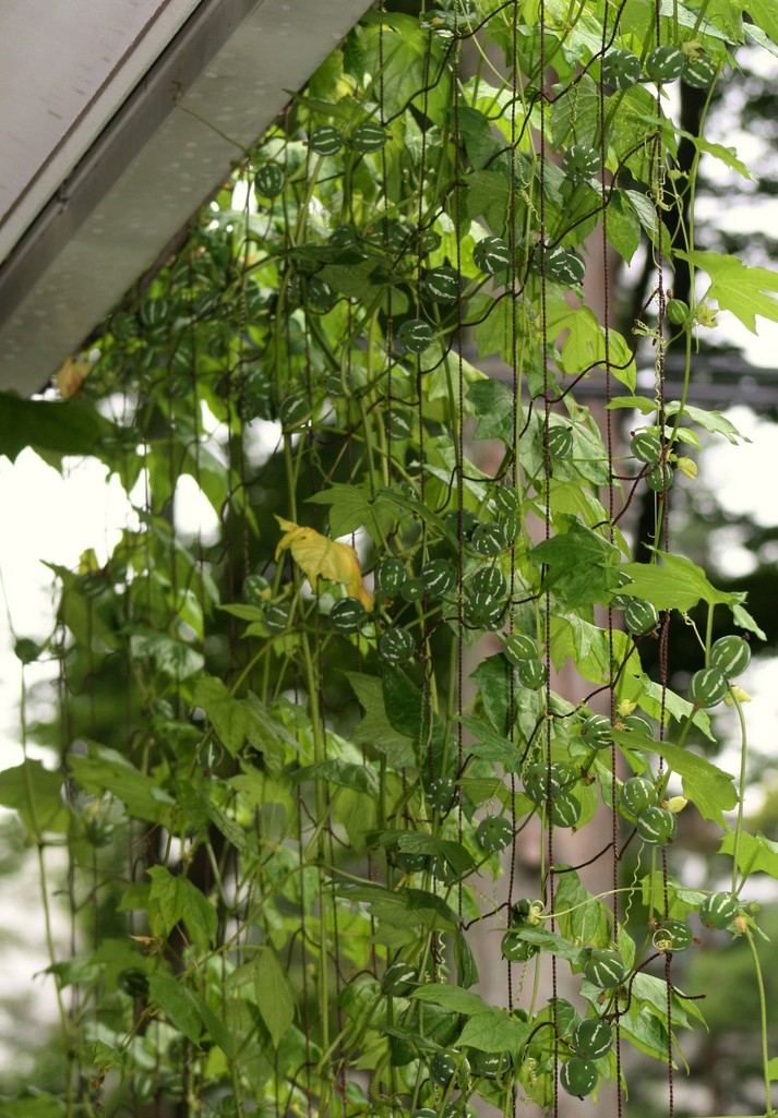 今年初めてグリーンカーテンに仕立てた沖縄スズメウリ。可愛い小さなスイカのような実が鈴なりです。実は直径2~3cmと小さくて食べられませんが、もう少しするとこのまま赤く色付いてとっても綺麗になります。