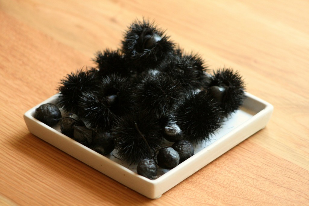 今日は、近所に落ちている栗や胡桃を 缶に詰めて炭火で蒸し焼きにし、花炭を作りました。炭にすると元の大きさの3分の2くらいに縮みますが、クリのイガイガに包まれた栗がとっても可愛らしいですよ。