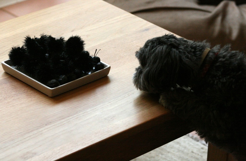 出来上がった花炭をテーブルに置いたら、クーチャンがこれは何だ、食べられるのかなって大いに興味を持ったようです。