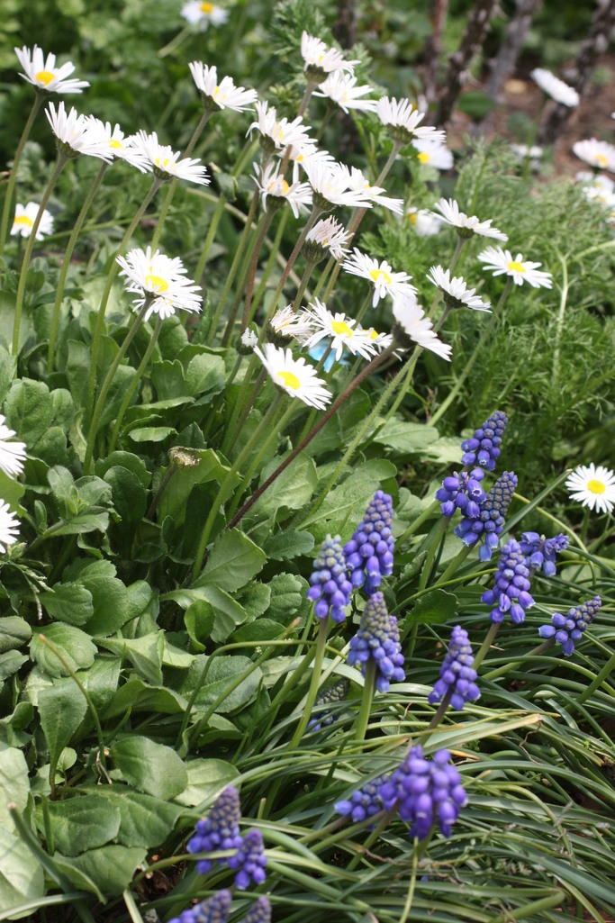 ムスカリって種もできるから、あちこちによく増えますよね。ブルー&ホワイトガーデンもとってもすてき、デージーもたっぷり咲いていて可愛いです。