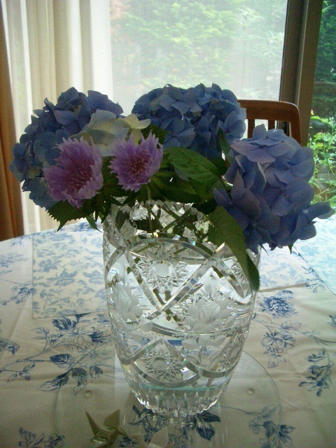 手前の紫ぽんぽんは今も庭で時々咲いてくれています。紫陽花とあわせたときのものです。