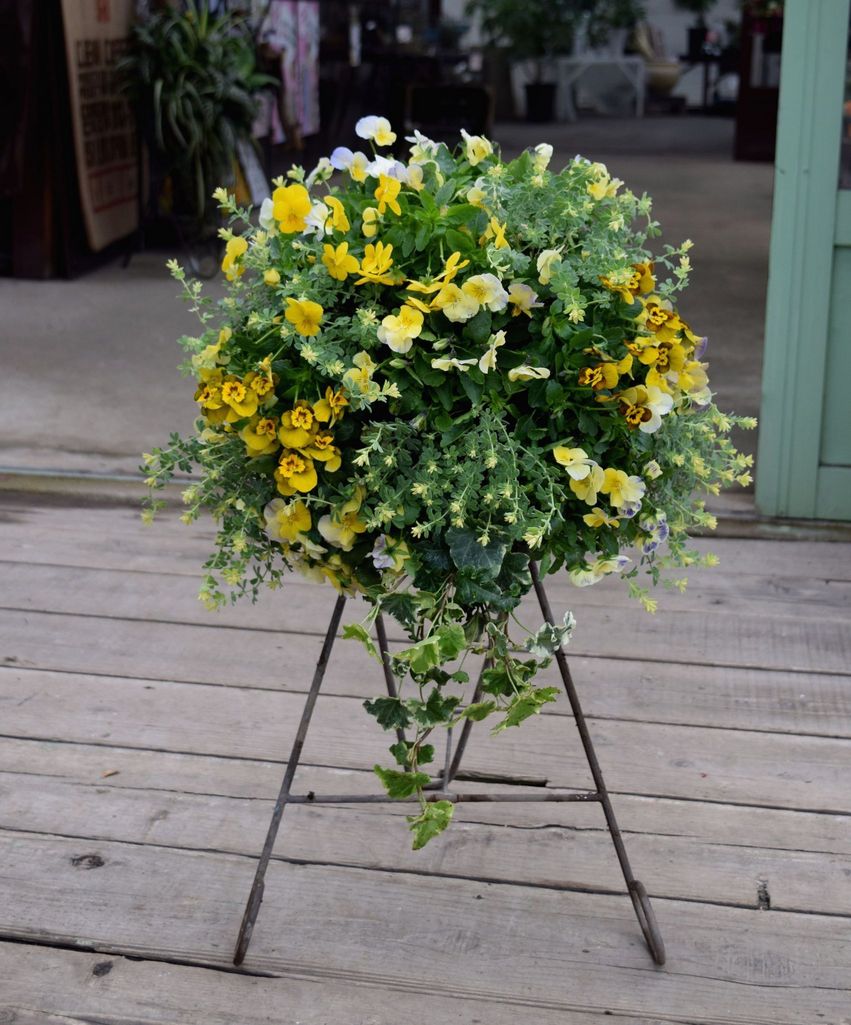 黄色系ビオラとロータスブリムストーンで、ふわふわしたハンギングを作りました。