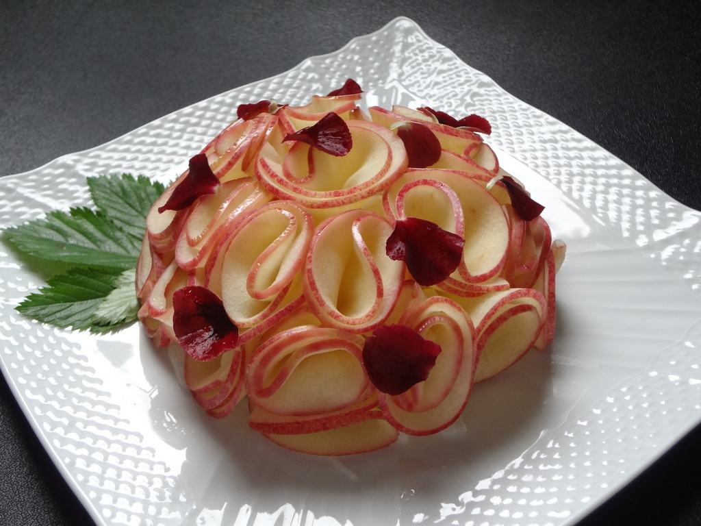 料理また菓子も得意です。 リンゴをカールさせ、パンジーの花びらを飾りました。 『植をベースに、食を魅せるキュレーター』 サラダにも、菓子のトッピングにも応用できます。