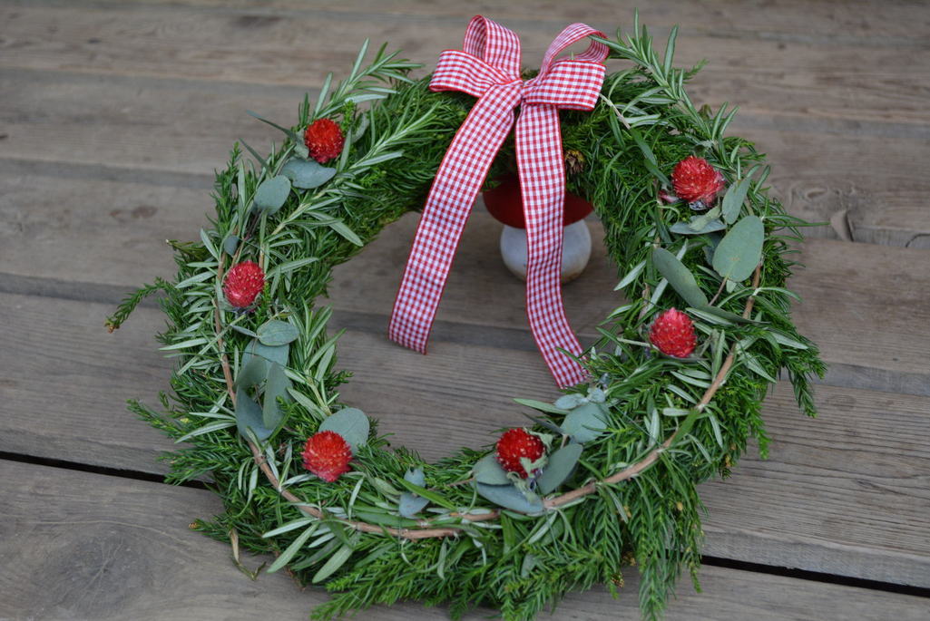 杉の葉がベース。ローズマリー・ユーカリも一緒に丸めてセンニチコウをアクセントに。