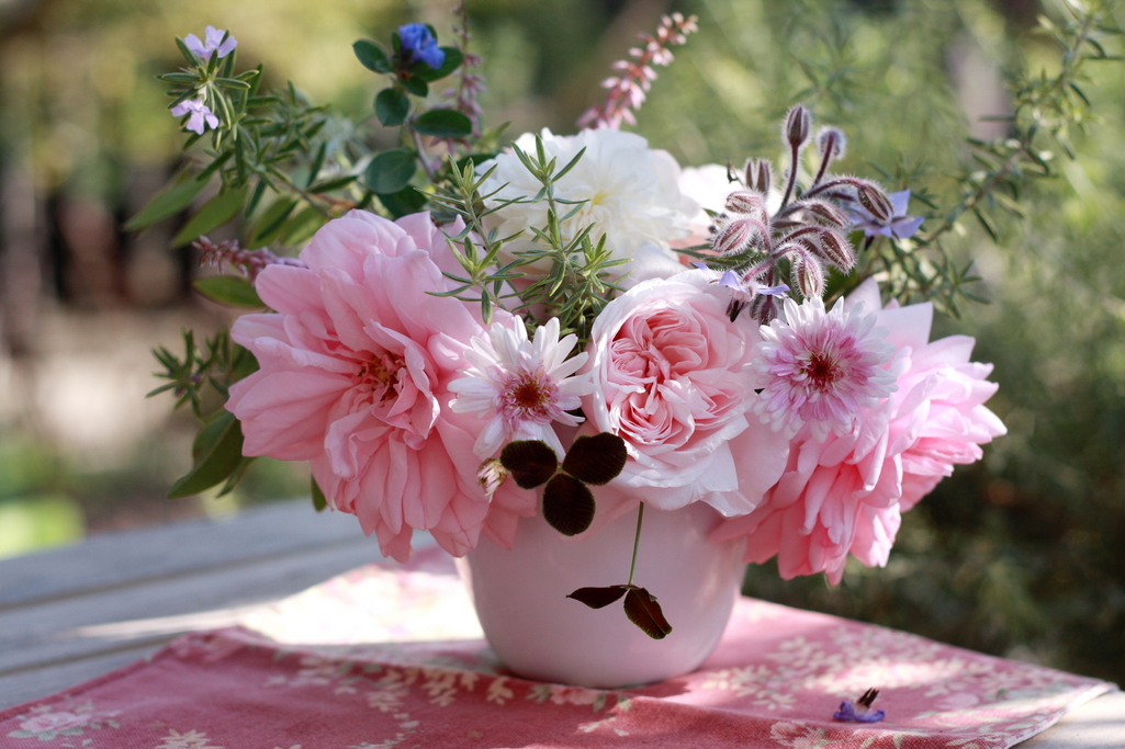 朝のアレンジに少し花を足して眺めていると横から光が当るようになって。輝きが増したような気がします。