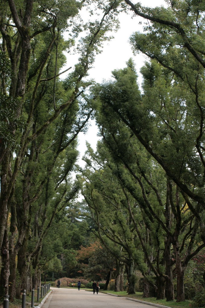 植物園のシンボル的存在クスノキ並木・樹齢100年近いクスノキの並木が200メートル続いている。
