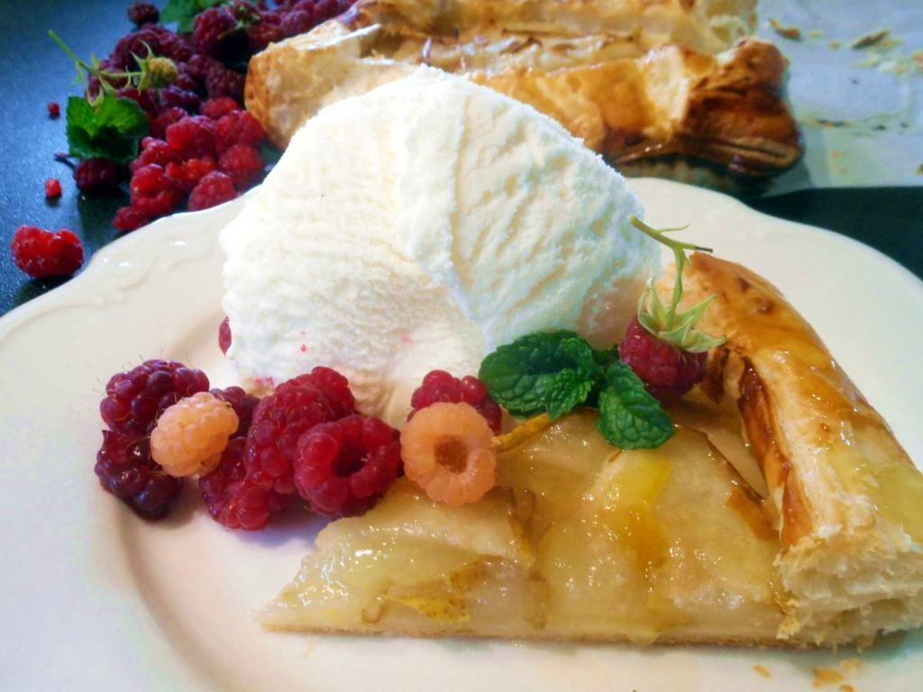 自家製のラズベリーを添えた、熱々のパイです。