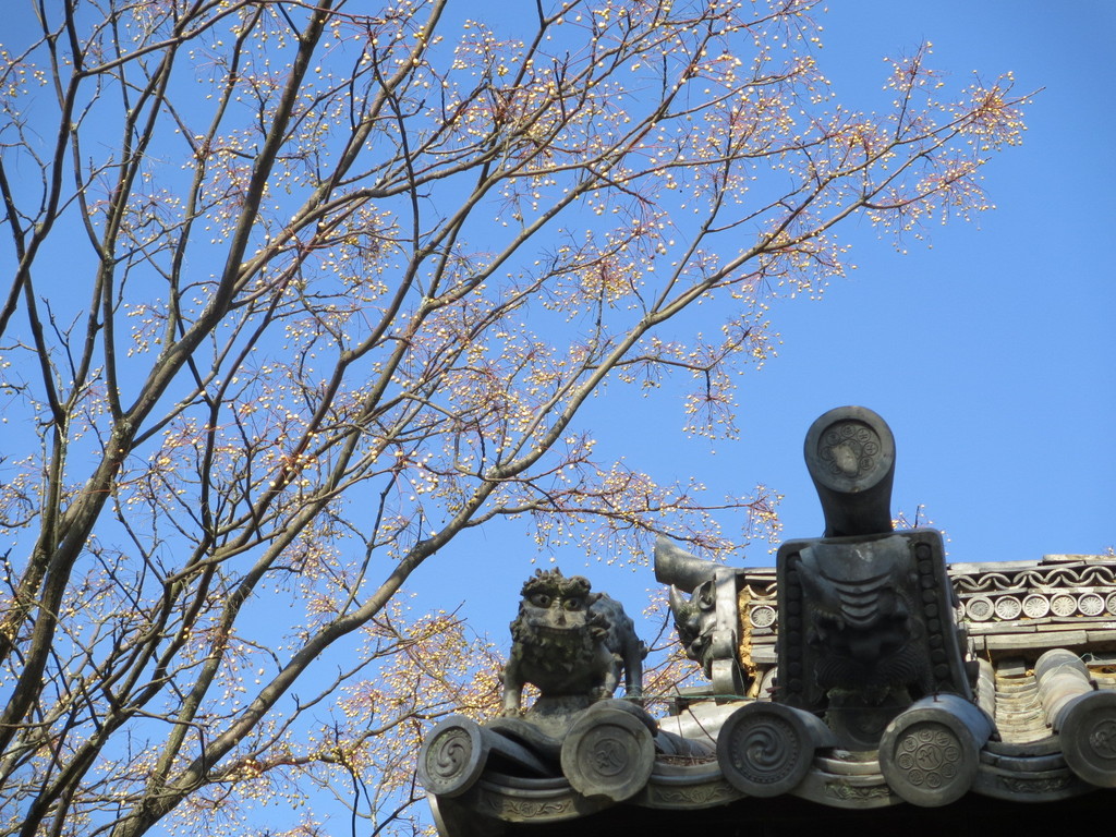 栴檀の実が鈴なりです。鬼瓦の横の獅子が何とも可愛らしい。