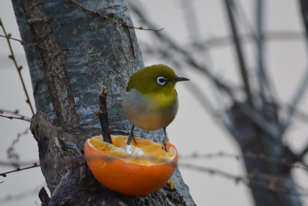 姫リンゴの木にオレンジを刺したら、直ぐにメジロが来ました。