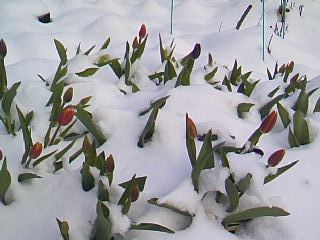 開花しそうなチューリップに雪なんて酷いですね。