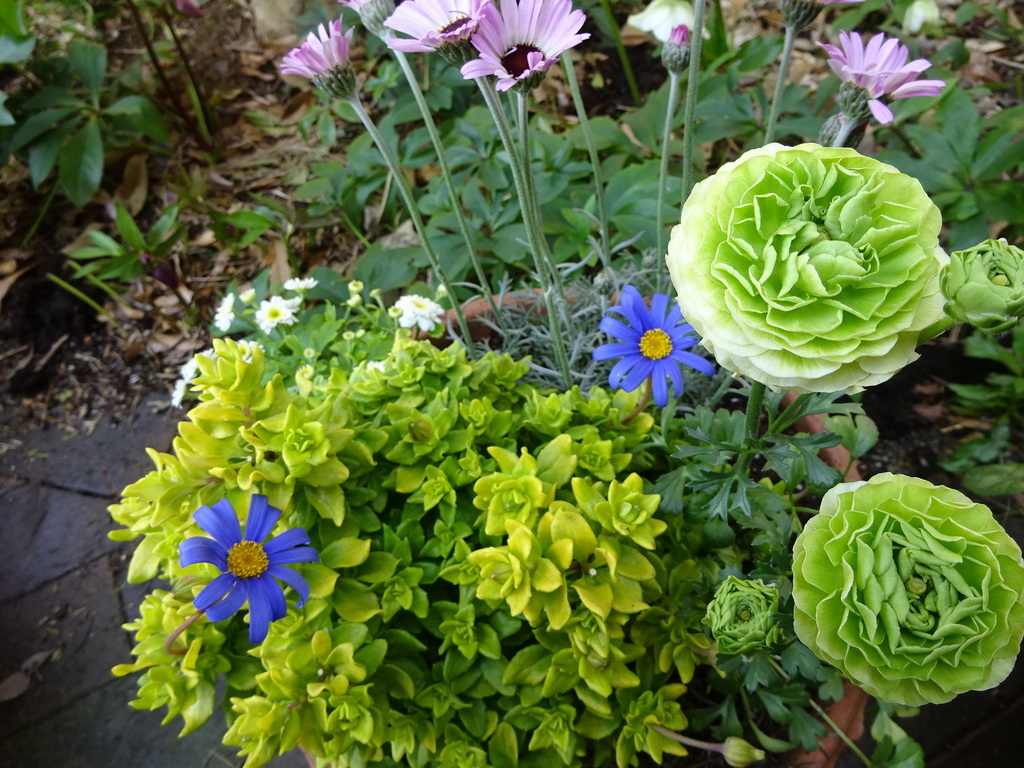寄せ植え・・黄金葉とブルーの花のコントラストが素敵なブルーデージーハニーブルー、ラナンキュラスなど。