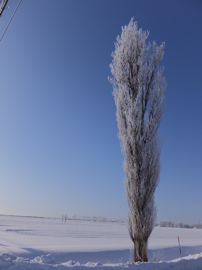 霧氷の日、魔法がかかったように ポプラの巨木が衣替え。