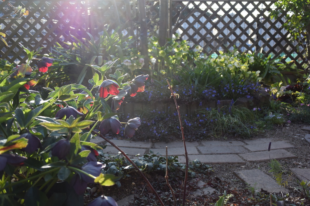 借景のお山の上に 夕日が沈む季節になりました。 沈む夕日からの光が ブラックのクリスマスローズに注いでいます。