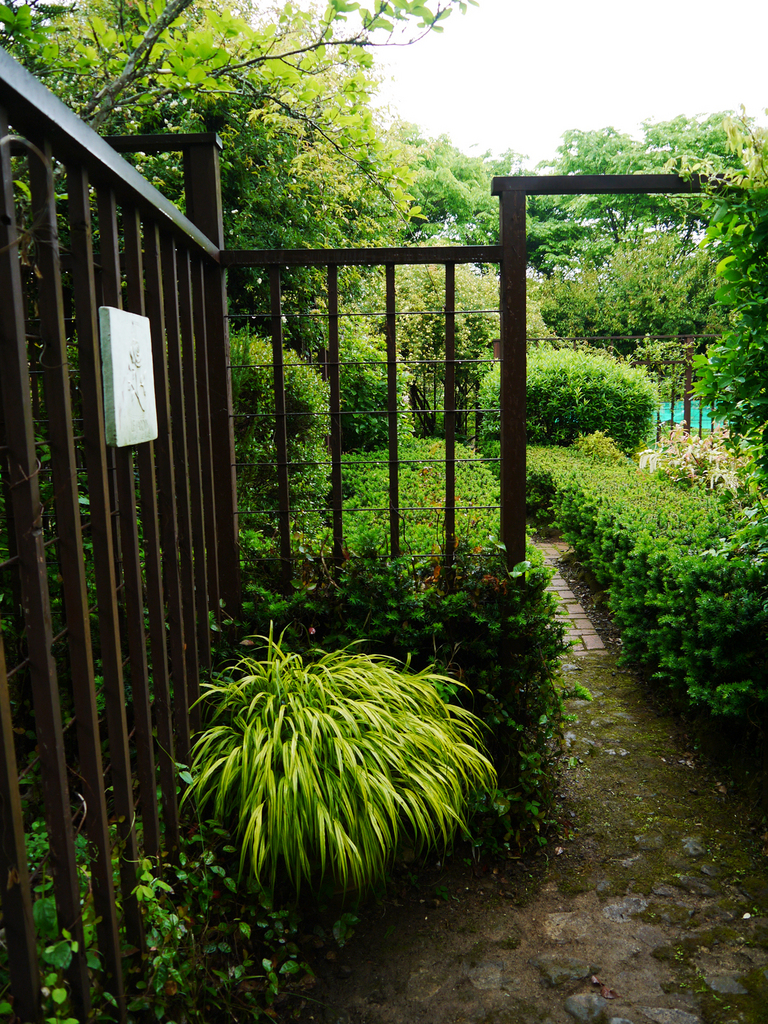 アンダーガーデンは自家製トレリスとツゲの生け垣で部屋のように仕切っています。コンテナのフウチソウは年々大きくなっていきます