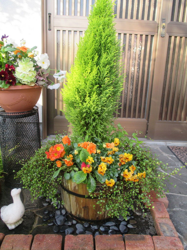 プリムラ、パンジー、フリルのパンジー、ワイヤープランツ、コニファー等を使っています。