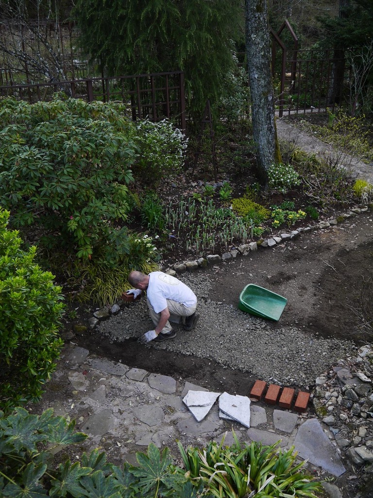 トップガーデンの庭。以前は西洋芝を植えていました。ところが周りの木々が大きくなりすぎ日陰になってしまい芝も元気がなくなってきたので思い切って石貼りをすることに・・・。 セメントを練って石を配置して、大変な作業。でも貼り終わった後の達成感は格別です