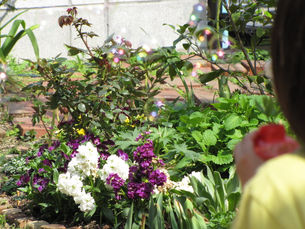 とても暖かい(暑い?)日でしたので、久々のシャボン玉遊びになりました♪ バラの新芽もシャボン玉でキラキラのお化粧をしてもらっています^^