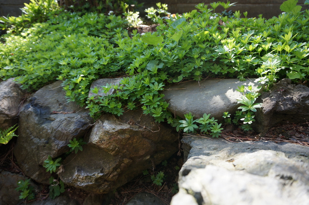 小さな白い蕾がたくさん隠れています。石の隙間にも根が広がって、これから咲く花が楽しみんです。