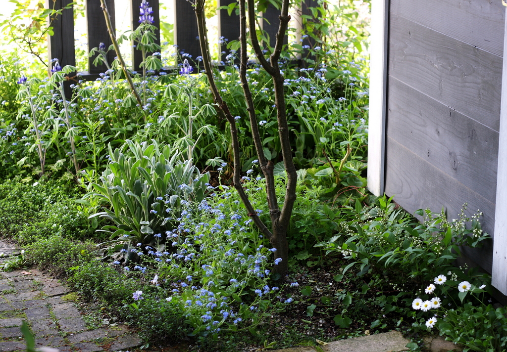 小屋の前、キングサリの下の植栽。