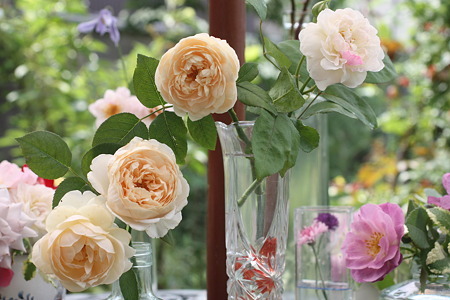 たっぷりの夏の日差しの下のバラ・・・虫に食べられるよりはとどんどん摘んで飾っていた頃の写真です。花はアンブリッジ・ローズなど・・・