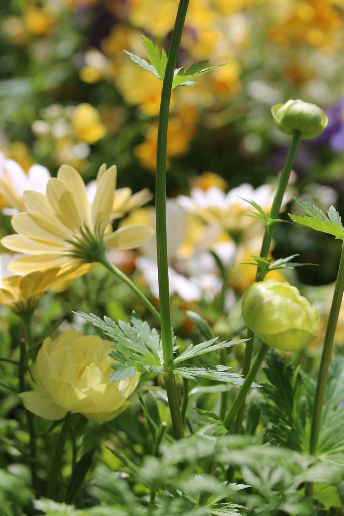 オステオスペルマムの、セレニティ スプリングティの花の裏は黄色です。 黄色のトロリウスニュームーンとの黄色コラボがかわいいです。