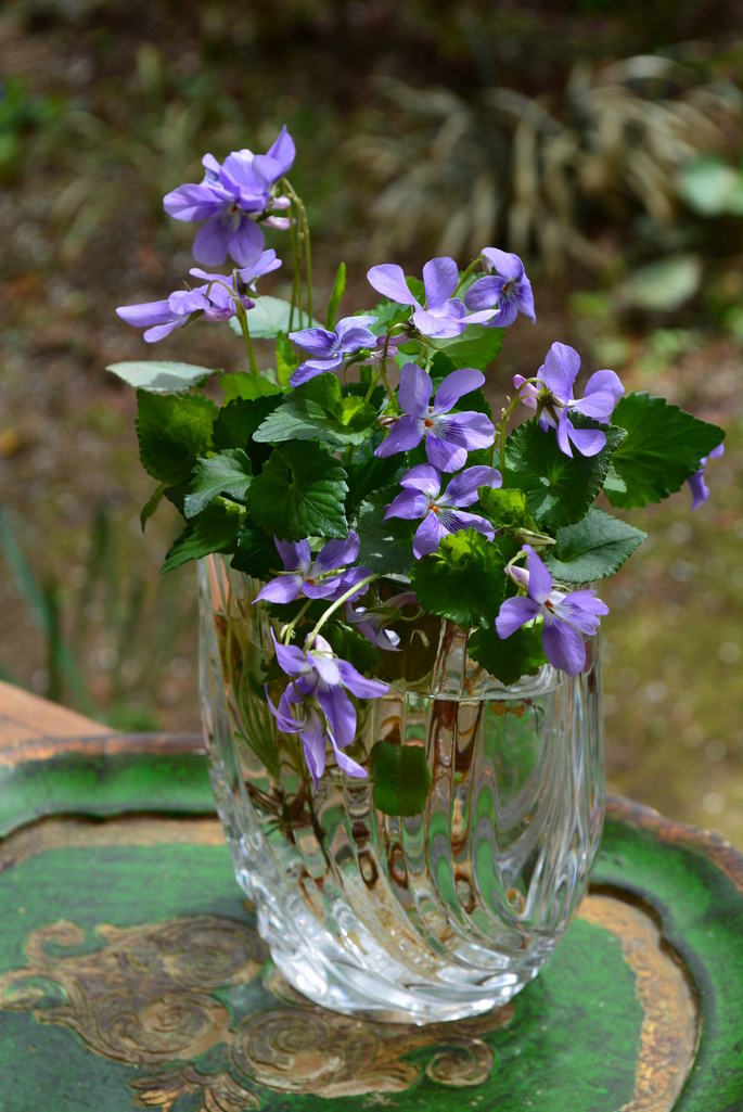 庭のスミレ、根っこごと花瓶にさしました。花が終わったらまた庭へ。